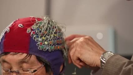 El profesor Junsei Horikawa explicó que el aparato, que se pone como un sombrero, es “una disposición especial de electrodos para registrar las ondas cerebrales” con el proyecto meta para reconocer palabras “ sin hablar”