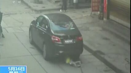 La emisora estatal china CCTV transmitió el video de vigilancia mostrando a una chica vestida de amarillo siendo atropellada por un automóvil cuando intentaba seguir a su hermano mayor y su hermana para cruzar la calle. La niña sólo sufrió lesiones leves en los dientes al caer en la brecha entre las ruedas del coche, dijo CCTV. Video: Reuters.