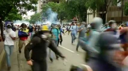 Ya son 60 días de protestas de la oposición, que han incendiado las calles de Venezuela. Dos meses de extrema violencia en los que han muerto 60 personas. Hasta los propios líderes de la oposición como Henrique Capriles han sufrido los estragos de los antidisturbios en las manifestaciones contra Maduro. Marchas masivas como esta última de universitarios en Caracas, que ha terminado como todas las demás, con la contundente represión de las fuerzas de seguridad. Con sus cañones de agua y el humo de sus gases lacrimógenos. Los chavistas también se han concentrado en la capital para apoyar a Maduro y su nueva Asamblea Constituyente que va a redactar una nueva Constitución. Mientras en Nueva York, los opositores se han manifestado frente a la sede de Goldman Sach por comprar 2 mil 500 millones de euros de deuda de la petrolera estatal venezolana. Acusan a la banco de Wall Street de financiar así al gobierno de Maduro. Video: Reuters.