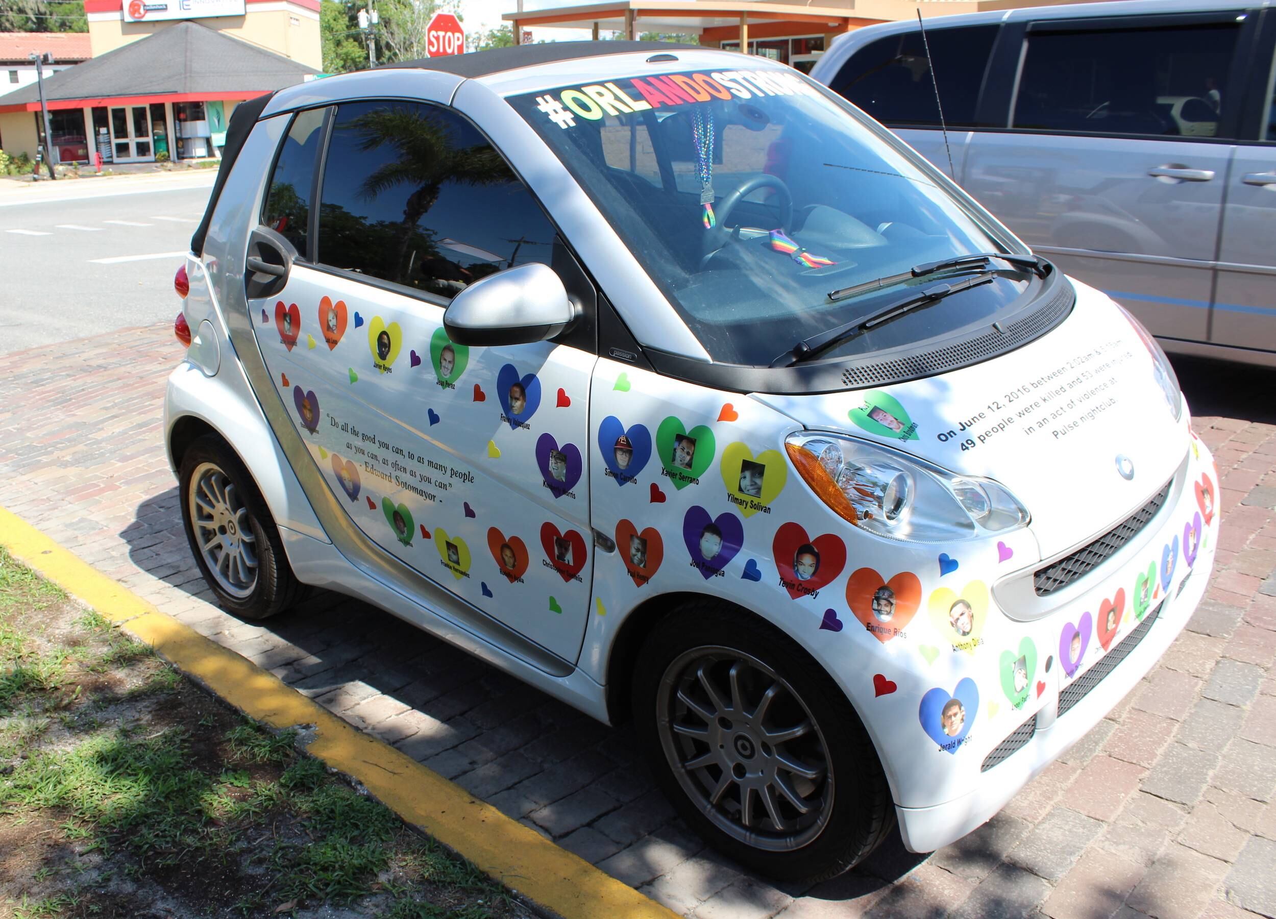 El auto tiene pegados 49 corazones que simbolizan a las 49 víctimas fatales, con sus nombres rostros. Además, tiene otros 53 corazones más pequeños también pegados, en honor a los sobrevivientes.