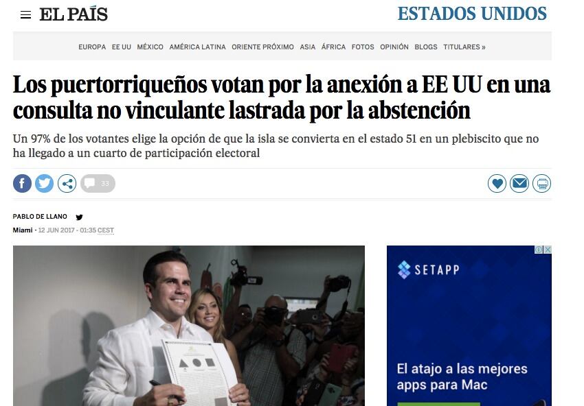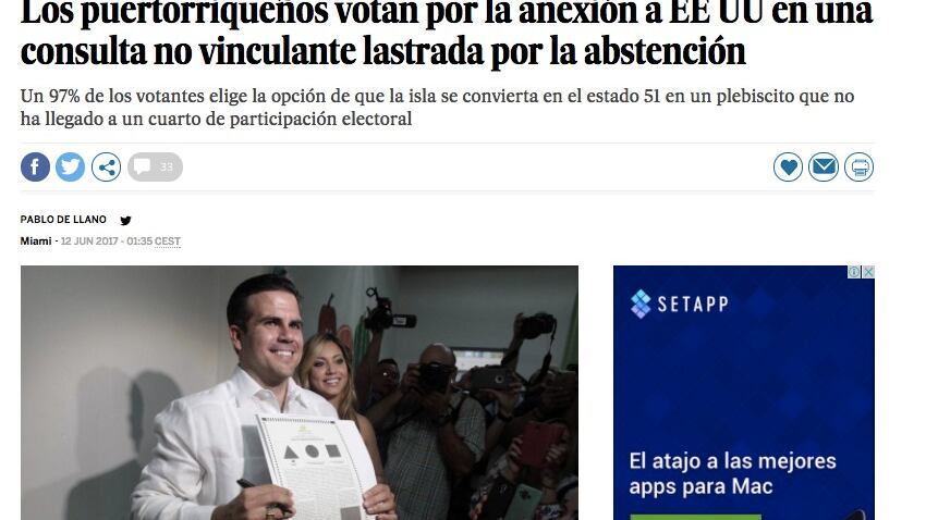 Titulares en prestigiosos medios como The New York Times, BBC y El País destacan que el resultado aabrumador a favor de la estadidad se dio en una consulta con escasa participación. Así mismo, se destaca que el plebiscito no fue vinculante.