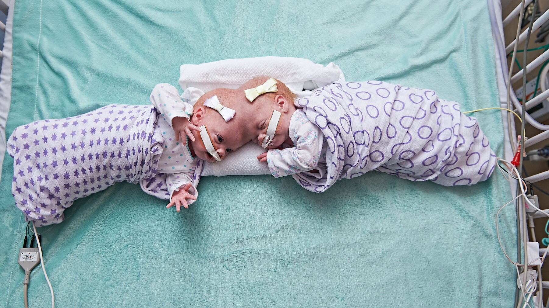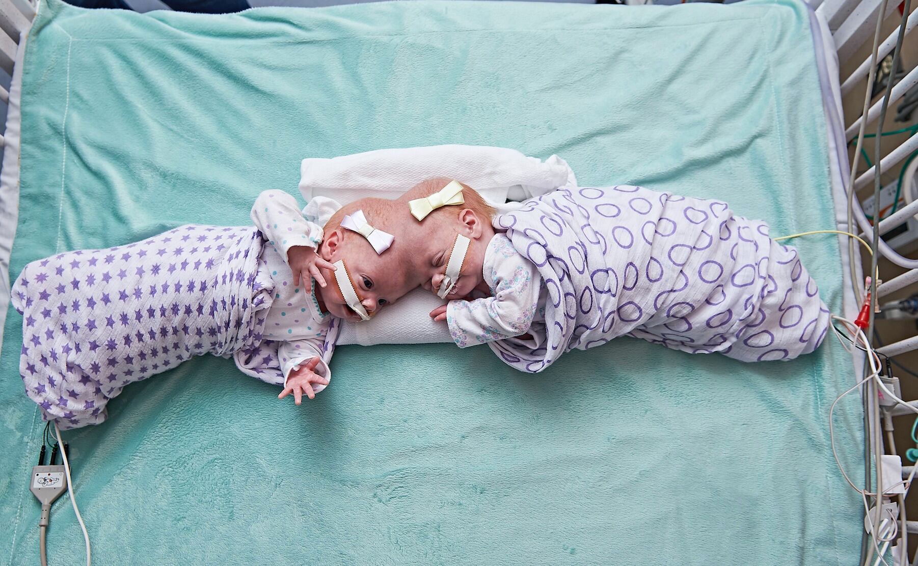 Las mellizas estaban unidas en la parte superior de sus cabezas, lo que se describió como el tipo menos común de siameses. Nacieron por cesárea a fines de julio, 10 semanas antes de la fecha esperada.