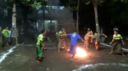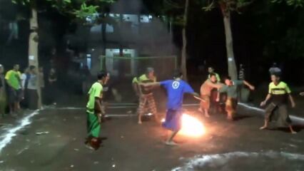 En dos equipos, los estudiantes patearon la bola de fuego entre sí en un campo de fútbol asfáltico, anotando ocasionalmente goles en la red de cada equipo.Después del partido abrasador, los estudiantes tomaron un descanso, con piernas y pies cubiertos de ceniza. Cuando le preguntaron qué había estado haciendo, Abdul Rahman dijo que había estado jugando “bola de fuego después de las oraciones de Taraweeh durante este mes de ayuno para evitar el aburrimiento”. La práctica de la bola de fuego es una tradición relacionada con “Pencak Silat”, un arte marcial indonesio tradicional. Video: Ruptly.