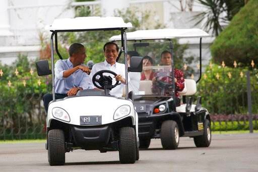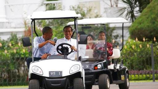 Los dos se subieron a un carro de golf, con Widodo al volante, y se dirigieron a un café en medio de los jardines. Muchos indonesios comparan a Widodo con Obama, por su gran popularidad.