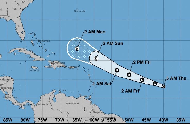 En su boletín más reciente, el NHC indicó que la depresión tropical se encuentra a unas 1.435 millas (2.305 kilómetros) kilómetros al este de las Antillas Menores (islas de Sotavento) y presenta vientos máximos sostenidos de 30 millas por hora (45 km/h).