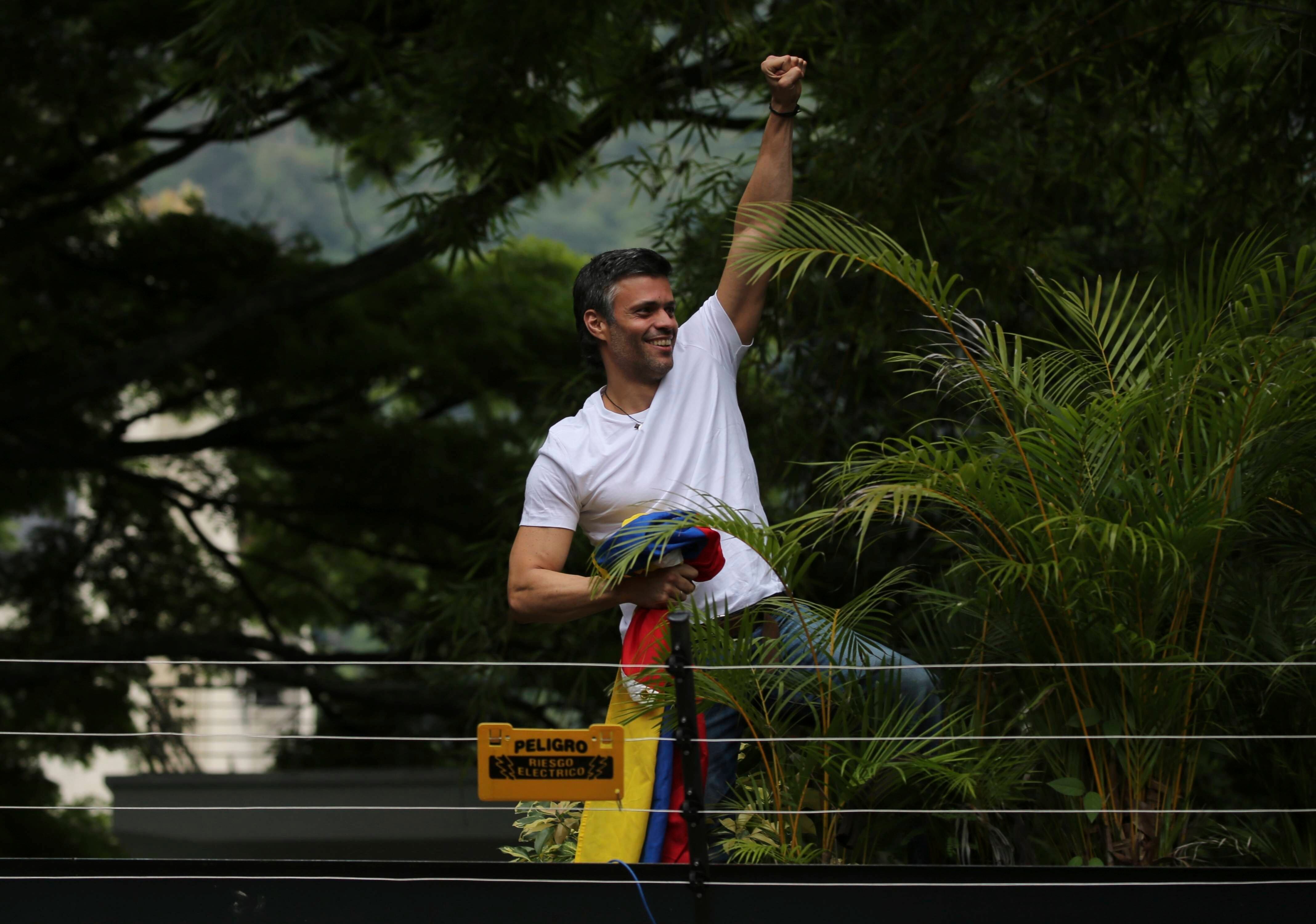 Horas después de regresar a su casa en el vecindario exclusivo de los Palos Grandes, en el este de la capital, López apareció muy sonriente en la puerta vistiendo camisa blanca, agitando una bandera venezolana y alzando el brazo derecho para saludar a centenares de seguidores, muchos de los cuales lanzaron sus gorras tricolores hacia la casa.