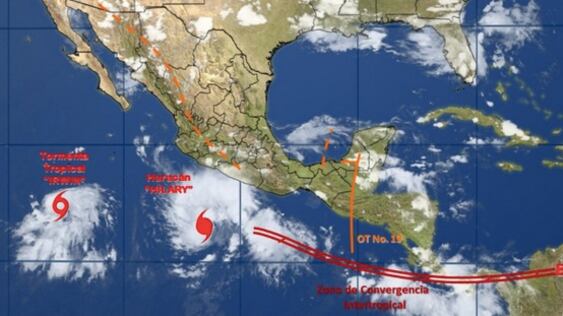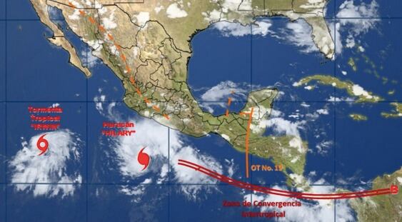 El Centro Nacional de Huracanes en Estados Unidos informó que el vórtice de Hilary se localizaba a 560 kilómetros (345 millas) al sur de Manzanillo y que avanzaba hacia el oeste-noroeste a 13 km por hora (8 millas por hora), en dirección paralela a la costa.