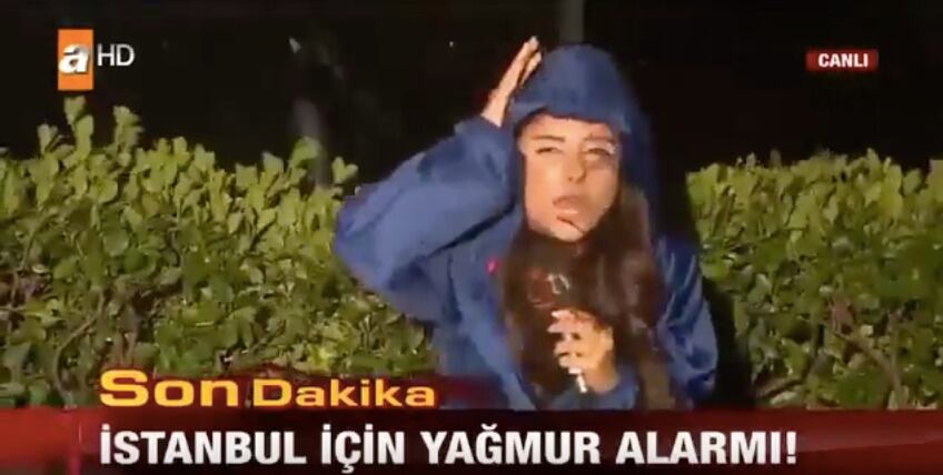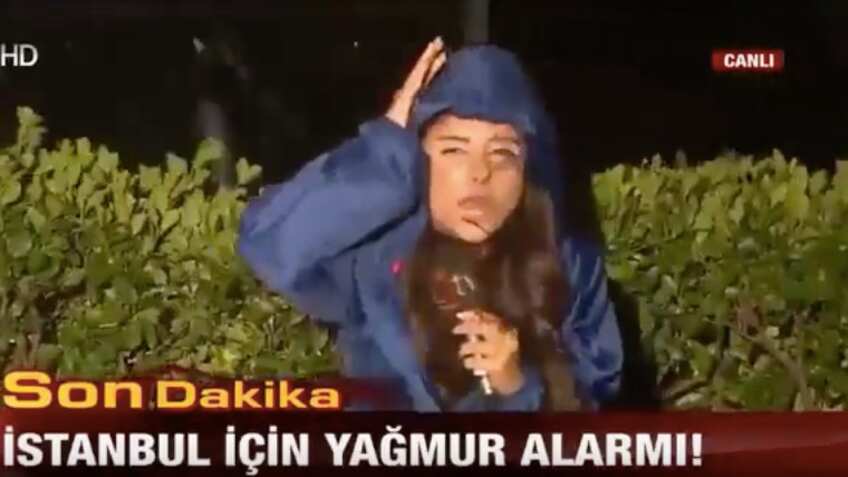 Son muchos los reporteros que desafían las inclemencias del tiempo para llevar la información. Este es el caso de una reportera de canal de televisión turco ATV quien se mantuvo bajo una violenta lluvia de granizo durante un en vivo.