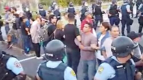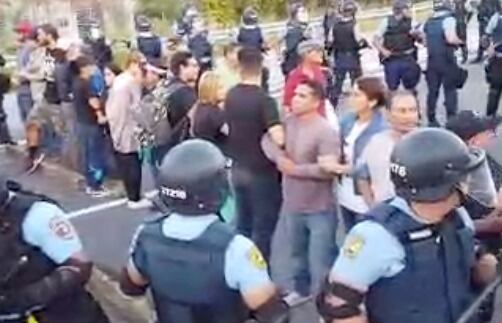Una fuerte presencia policiaca se encuentra en medio de la protesta.
