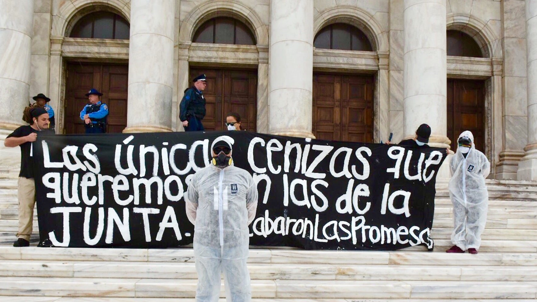 Miembros del colectivo Se acabaron las promesas, a un año del nombramiento de los integrantes de la Junta de Supervisión Fiscal (JSF) lanzaron hoy cenizas en las escalinatas del Capitolio e hicieron un llamado a tomarse las calles el 31 de agosto “para demostrar el repudio del pueblo a la Ley Promesa y a la dictadura de banqueros y empresarios que impuso sobre Puerto Rico”.
