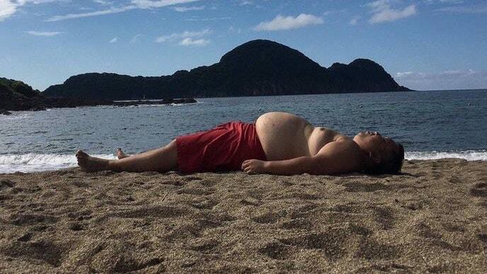Quizás se trate de una de las mejores fotos de vacaciones de verano. Disfrutando de la playa en una isla, un turista se tomó una foto en la que se puede observar cómo su cuerpo parece estar esculpido con la misma simetría que el telón de fondo montañoso.