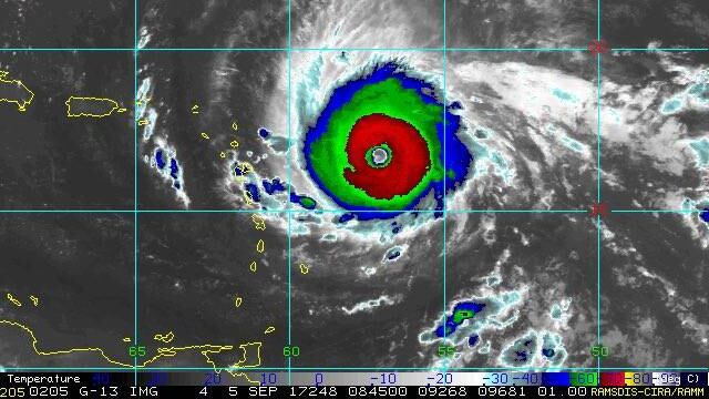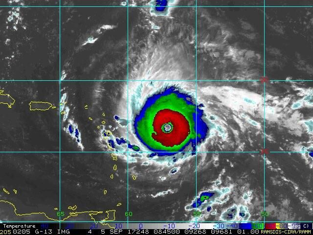 El boletín de las cinco de la mañana ubicaba el huracán de la siguiente forma: Latitud: 16.6°N Longitud: 57.0°O Vientos: 150mph (Categoría 4) Movimiento: Oeste a 14mph. Se proyecta que pase a unas 47 millas al norte de Fajardo y de las islas municipios de Vieques y Culebra.