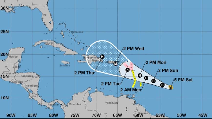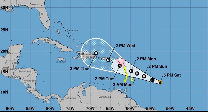 Para las islas de Santa Lucia, Martinica, Guadalupe y Dominica se emitió una vigilancia de tormenta. La meteoróloga de Noticentro, Deborah Martorell, indicó en sus redes sociales que “la primera trayectoria del boletín NHC no es alentadora ubicando a Puerto Rico justo al centro del cono entre miércoles y jueves”. Sin embargo, sostiene que hay incertidumbre en modelos a esta etapa de la trayectoria.