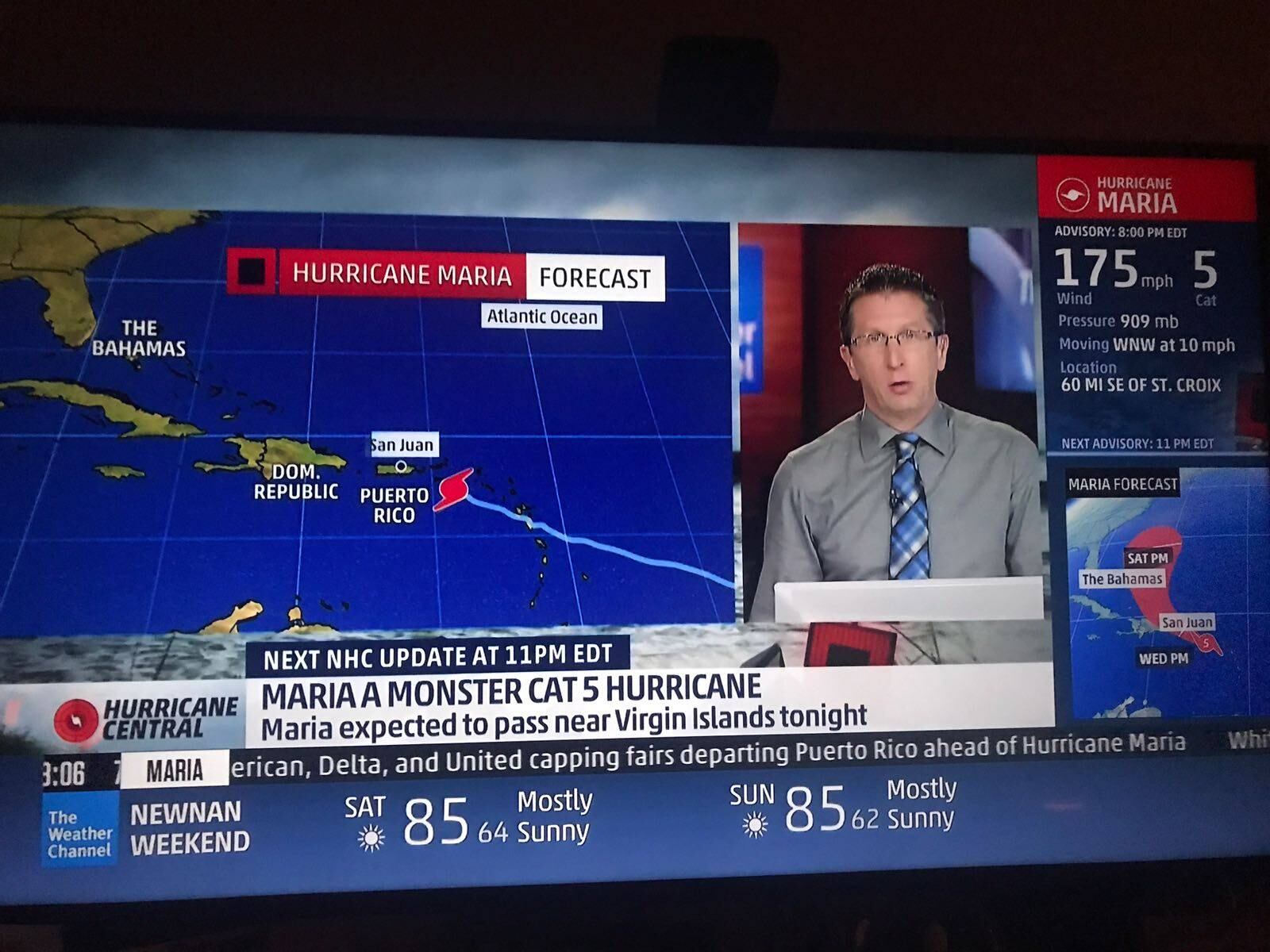María se mantiene como un huracán categoría 5 con vientos sostenidos de 175 millas por horas en su ruta hacia Puerto Rico.