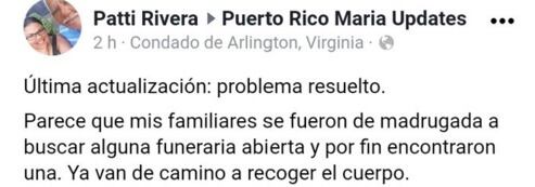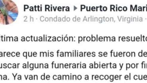 Pronto, la petición alcanzó notoriedad en redes sociales. Ahora la joven informa que por fin han podido darle los servicios funerarios adecuados a su familiar. Ya encontraron una funeraria abierta para recoger el cuerpo. Asimismo, la policía Yamilka Ortíz le prestó ayuda a Patti para poder comunicarse con su familia