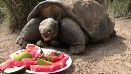 Una gigantesca tortuga de Galápagos en el Australian Reptile Park celebró su 67 cumpleaños el lunes (25 de septiembre) con un pastel de sandía. Hugo terminó el tratamiento rápidamente como sandía es uno de sus alimentos favoritos, de acuerdo con Amanda Woodbine, el director de marketing en el Parque de Reptiles de Australia. Aproximándose a la edad media en los años de la tortuga, Hugo se espera que viva entre 150-200 años, informó la prensa local.Como la especie viviente más grande de la tortuga, la tortuga de Galápagos es enumerada como vulnerable por la unión internacional para la conservación de la naturaleza. Video: Reuters.