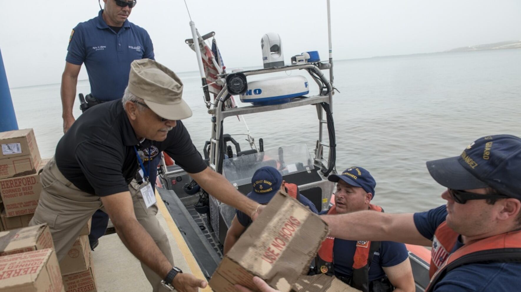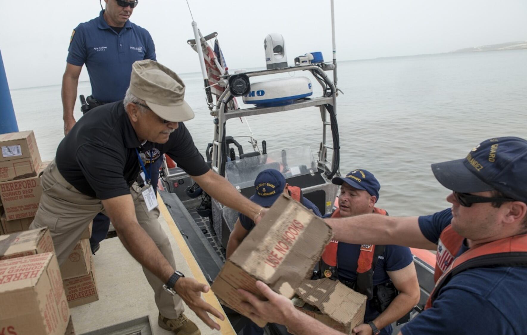 La Guardia Costera, junto a funcionarios locales, estatales y federales, descargó alimentos en un puerto deportivo cerca de Ponce, los que fueron transportados al municipio del sur por el guardacostas Venturous.