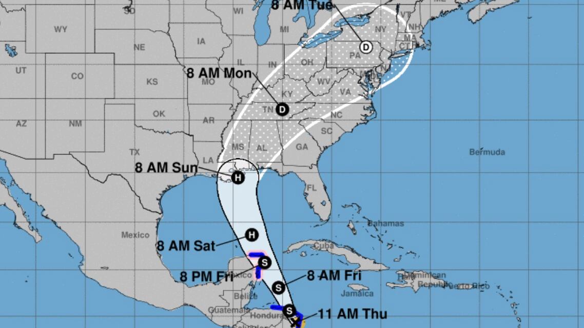 Los meteorólogos estiman que la tormenta tropical volverá a tomar fuerza en aguas del Caribe antes de llegar a México y, tras salir al Golfo de México, se podría convertir en un huracán horas antes de alcanzar la costa de EE.UU., donde podría tocar tierra en Luisiana, Misisipi, Alabama o el extremo noreste de Florida.