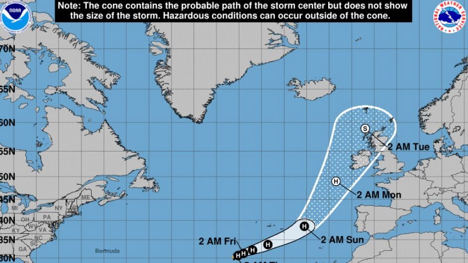 De esta manera podría pasar este fin de semana entre Azores y el también archipiélago luso de Madeira para dirigirse posteriormente hacia Irlanda, a donde podría llegar como huracán el próximo lunes, para alcanzar posteriormente el norte del Reino Unido el martes convertido ya en tormenta tropical.
