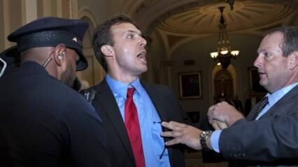 En una visita al Capitolio un hombre le gritó: “¡Trump es traición!” al momento que arrojó banderas de Rusia su apellido escrito. Los hechos ocurrieron en el Capitolio, a donde Trump acudió a un desayuno con líderes del Partido Republicano.