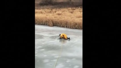 Los bomberos en Canadá salvaron la vida de un perro después de que quedó atrapado en un arroyo congelado mientras caminaban en Saskatchewan, Canadá, el miércoles (29 de noviembre). Se puede ver a un bombero deslizarse sobre el hielo sobre su estómago, mientras que otro bombero sostiene una cuerda unida a él. El video, que fue subido a Facebook por uno de los bomberos, ha cosechado más de 115.000 visitas. La leyenda del video dice “Ayer por la tarde, nuestros bomberos estaban ocupados en el arroyo rescatando a la mascota de alguien. Permitieron que su perro escapara de la correa cuando se aventuró en el hielo y cayó. La acción rápida de llamar al departamento de bomberos ayudó a salvar a su mascota”. El bombero continuó advirtiendo a la gente “por favor mantenga a sus mascotas y niños lejos del arroyo, el hielo es delgado y no es seguro”. Video: Reuters.