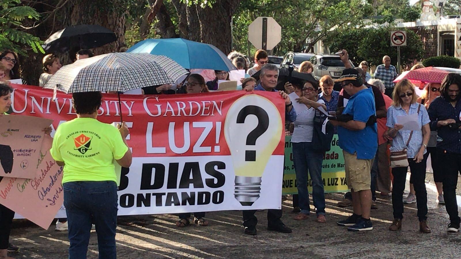 Un grupo de ciudadanos residentes de la Urbanización University Garden, en Río Piedras, decidió marchar hoy para exigir a la Autoridad de Energía Eléctrica (AEE) el restablecimiento de la luz en su vecindario.