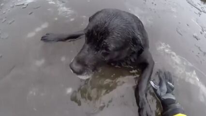 Las imágenes de la cámara captaron el rescate de Hardy, un labrador negro de nueve años, después de quedar atrapado en el hielo del río Wansbeck, en Northumberland, Inglaterra.