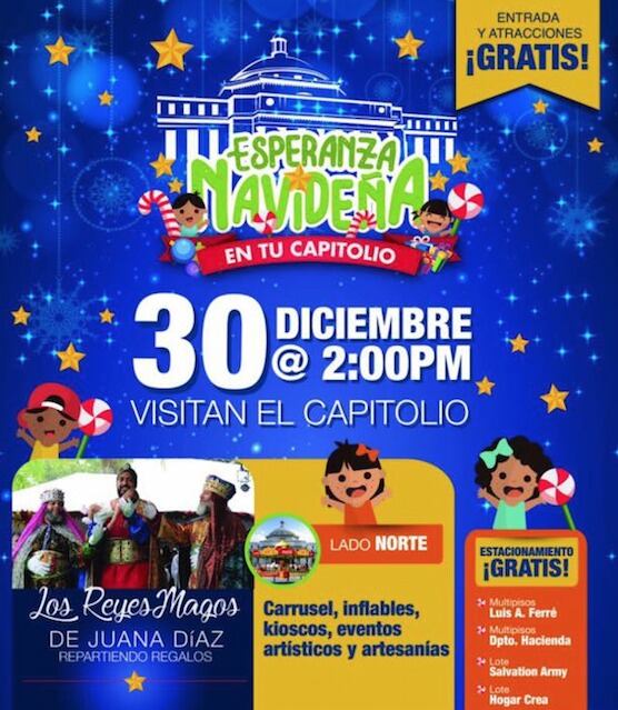 Dijo Rivera Schatz en un anuncio en su cuenta de Facebook: “Te invito a que este sábado, 30 de diciembre de 2017; lleves a tus niños al evento #EsperanzaNavideñaEnTuCapitolio, donde tendremos la visita de los Reyes Magos de Juana Díaz, quienes estarán repartiendo regalos en el lado Norte del Capitolio”.