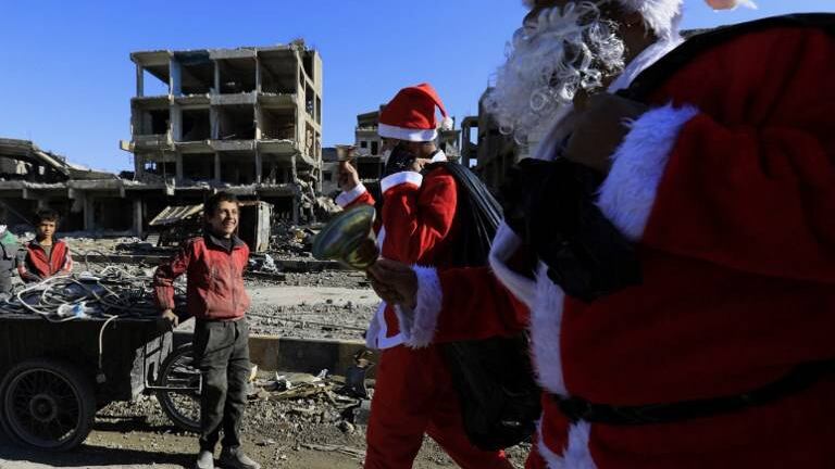Vestidos con sus tradicionales trajes rojos, barbas blancas y sacos negros llenos de regalos a la espalda, el martes recorrieron esta ciudad, devastada por cuatro meses de combates entre los yihadistas del grupo Estado Islámico (EI) y los combatientes de las Fuerzas Democráticas Sirias (FDS), una alianza kurdo-árabe apoyada por Washington.