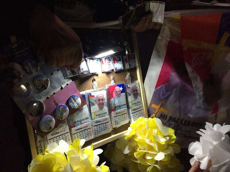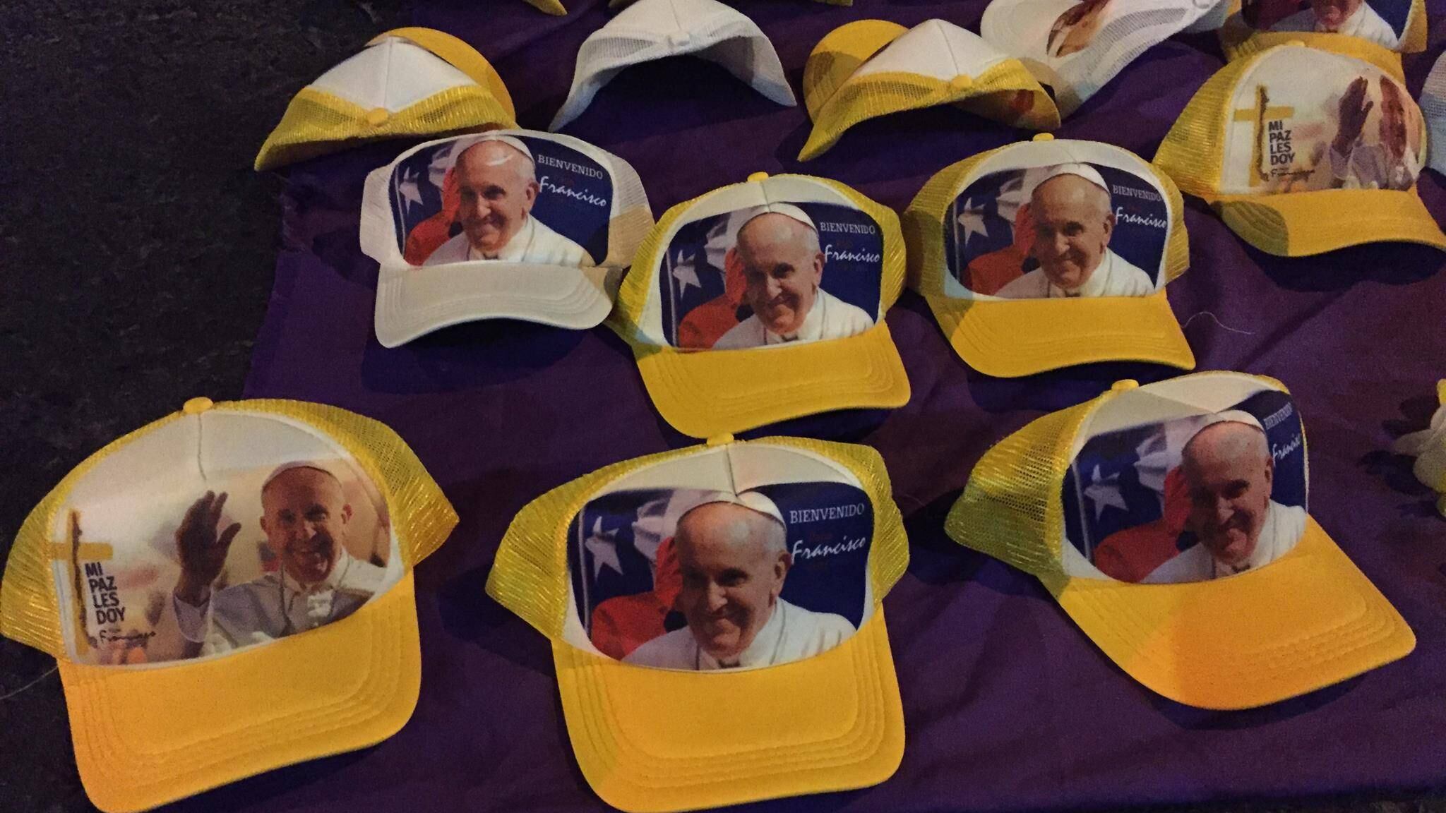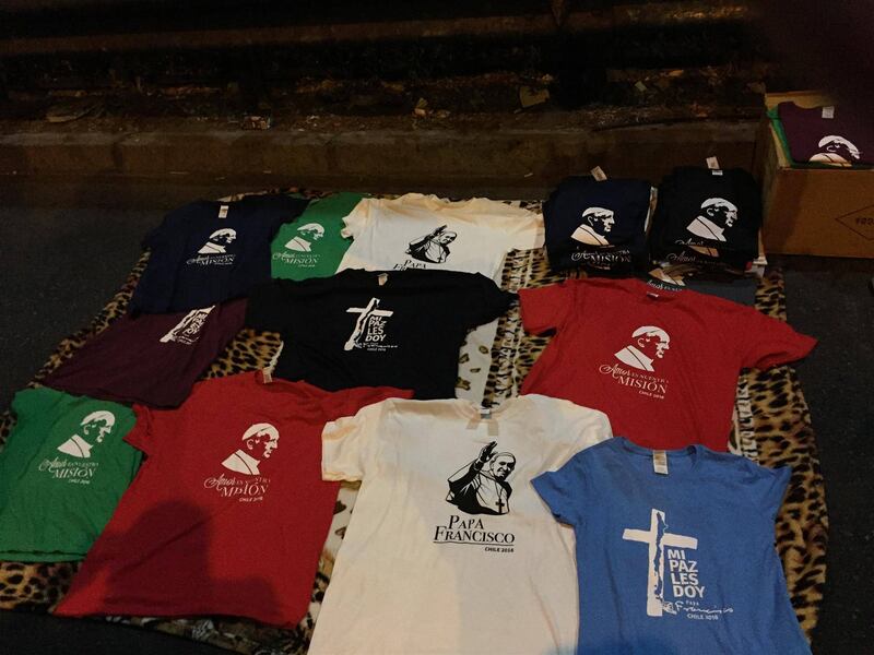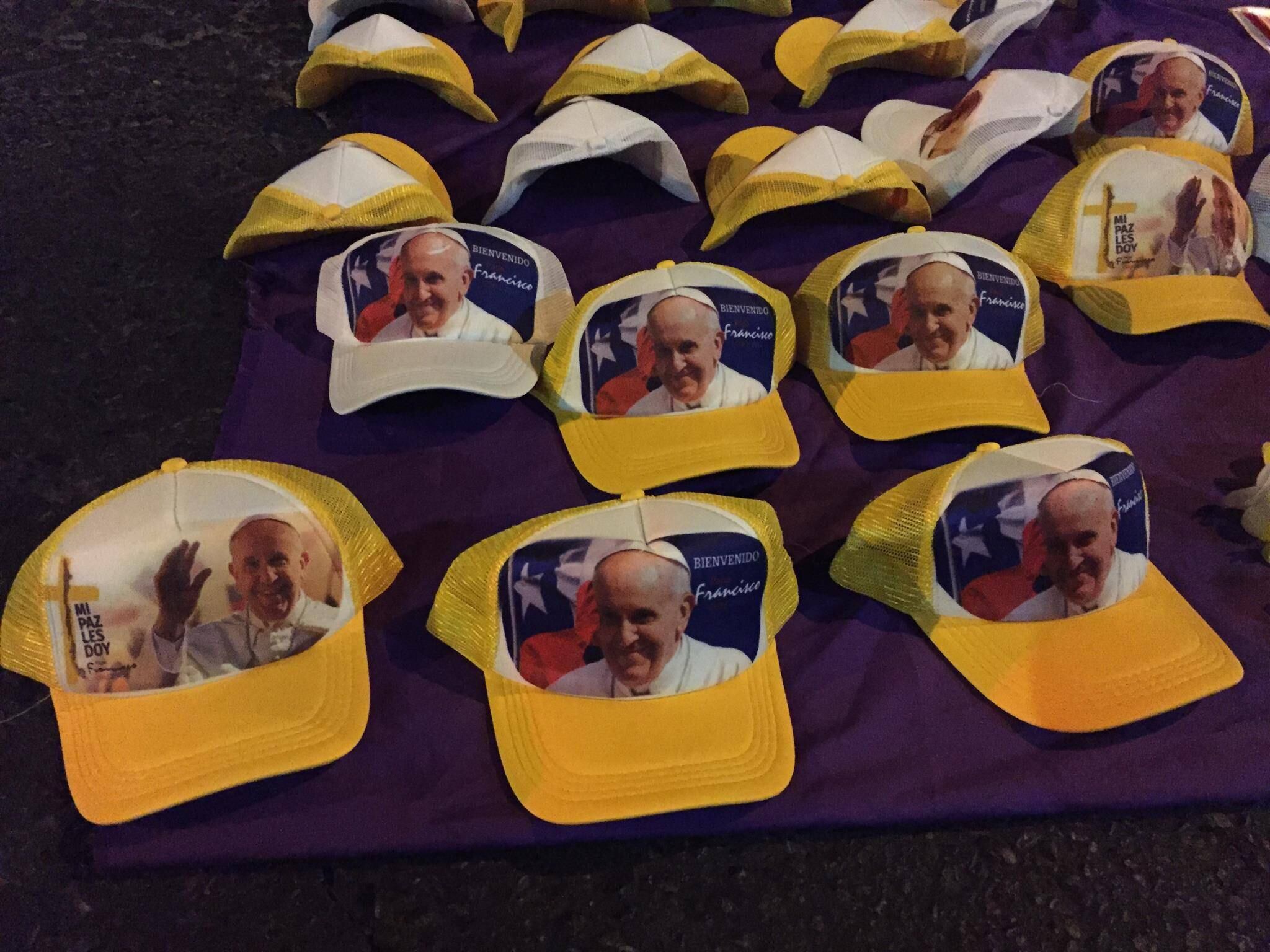 La madrugada antes de la esperada misa del Papa Francisco en Santiago de Chile estuvo llena de colores y mercadería alusiva a la sexta visita del Pontífice a Sudamérica, que luego lo llevará a Perú.