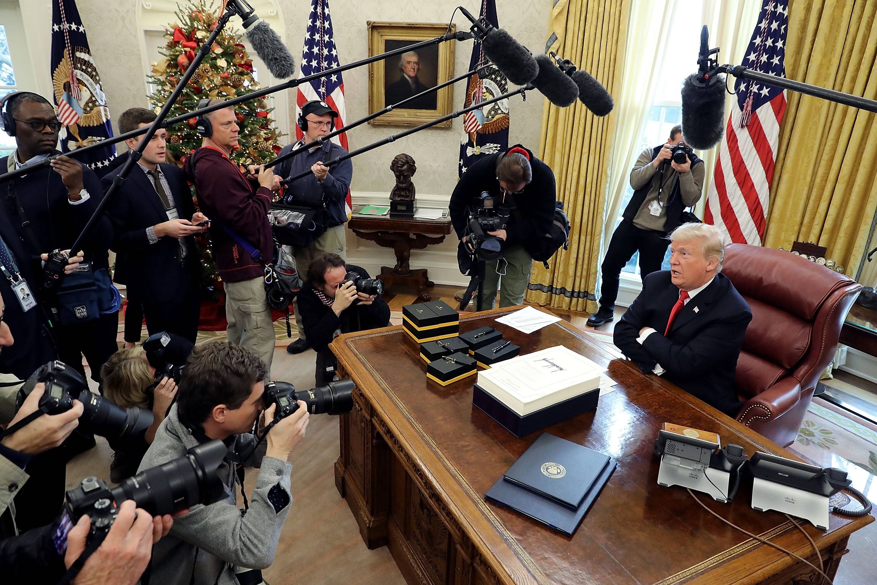 También en diciembre, Trump celebró junto al líder del Senado, Mitch McConnell, así como el líder de la Cámara, Paul Ryan, el vicepresidente Mike Pence y miembros de su equipo de trabajo en Casa Blanca, la aprobación de una reforma fiscal que ha sido calificada por sus partidarios como el mayor triunfo legislativo de Trump y el Partido Republicano durante el primer año de la actual administración, pero que también ha suido condenada como una reforma que otorga grandes beneficios en recortes de impuestos a las empresas y aquellos con mayores ingresos y alivios menores a las clases media y baja. [Foto 11 – Celebración en Casa Blanca – AP