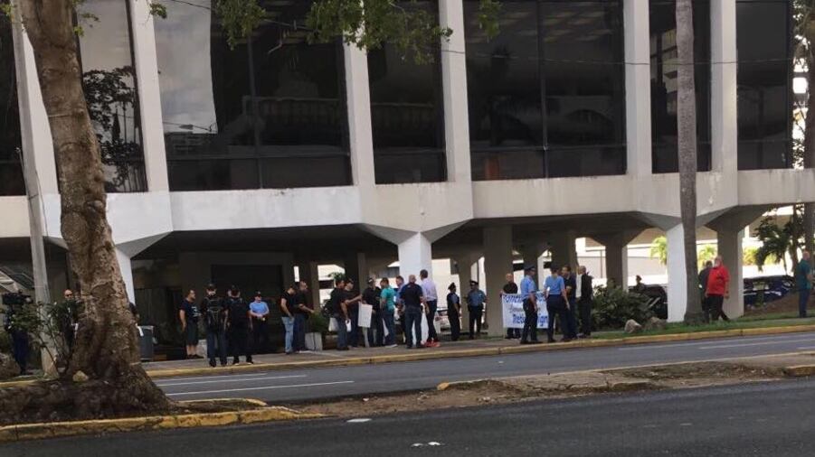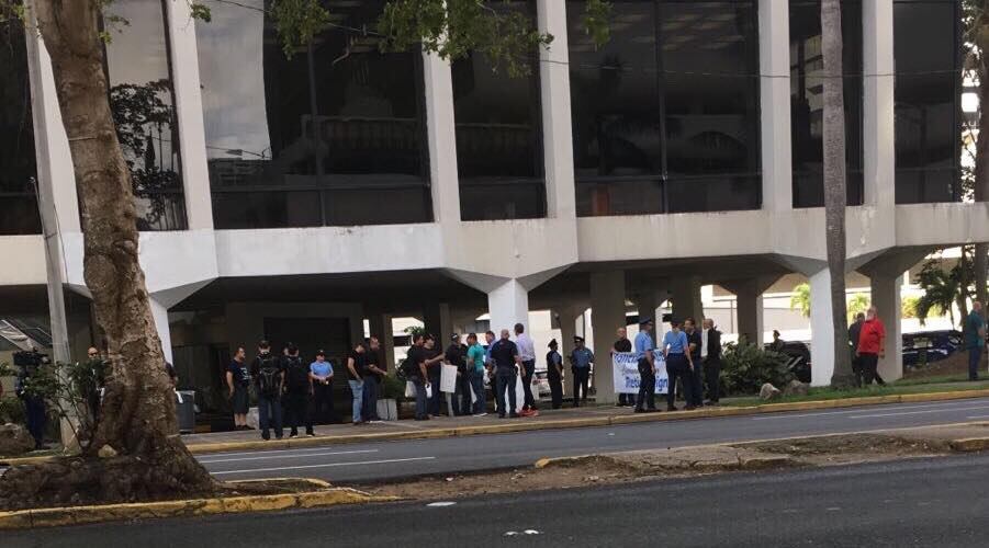 Decenas de policías, vestidos de negro, se manifiestan a esta hora en Hato Rey para exigir mejoras laborales.