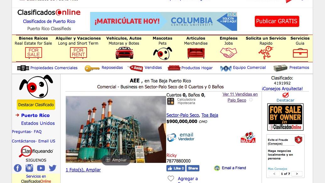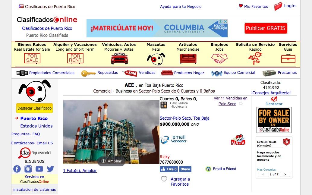 A solo horas del mensaje del gobernador, Ricardo Rosselló, anunciando la venta de la AEE, apareció el anuncio —no genuino— en la plataforma de ventas Clasificados On Line. El aviso aparece bajo el título “AEE , en Toa Baja Puerto Rico” y establece que es en el sector Palo Seco.