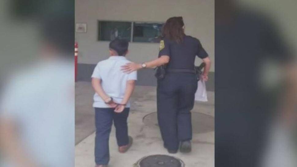 El incidente fue registrado en video por muchos de quienes observaron el hecho y la imagen del menor llevado esposado por una agente policial se ha vuelto viral en redes sociales.