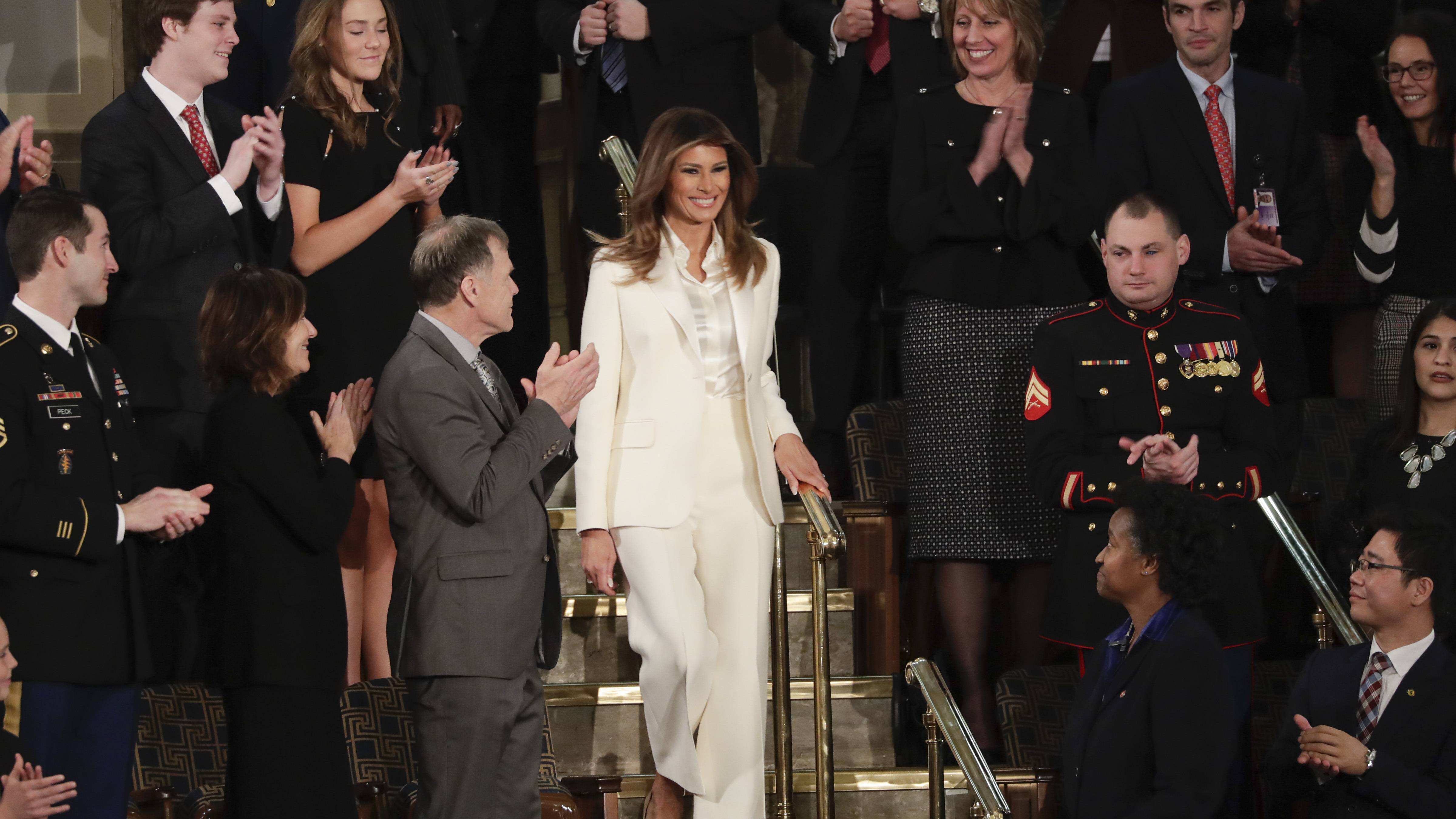 A su llegada, la primera dama estadounidense arrancó aplausos de los presentes. Trump la mencionó al inicio del mensaje.