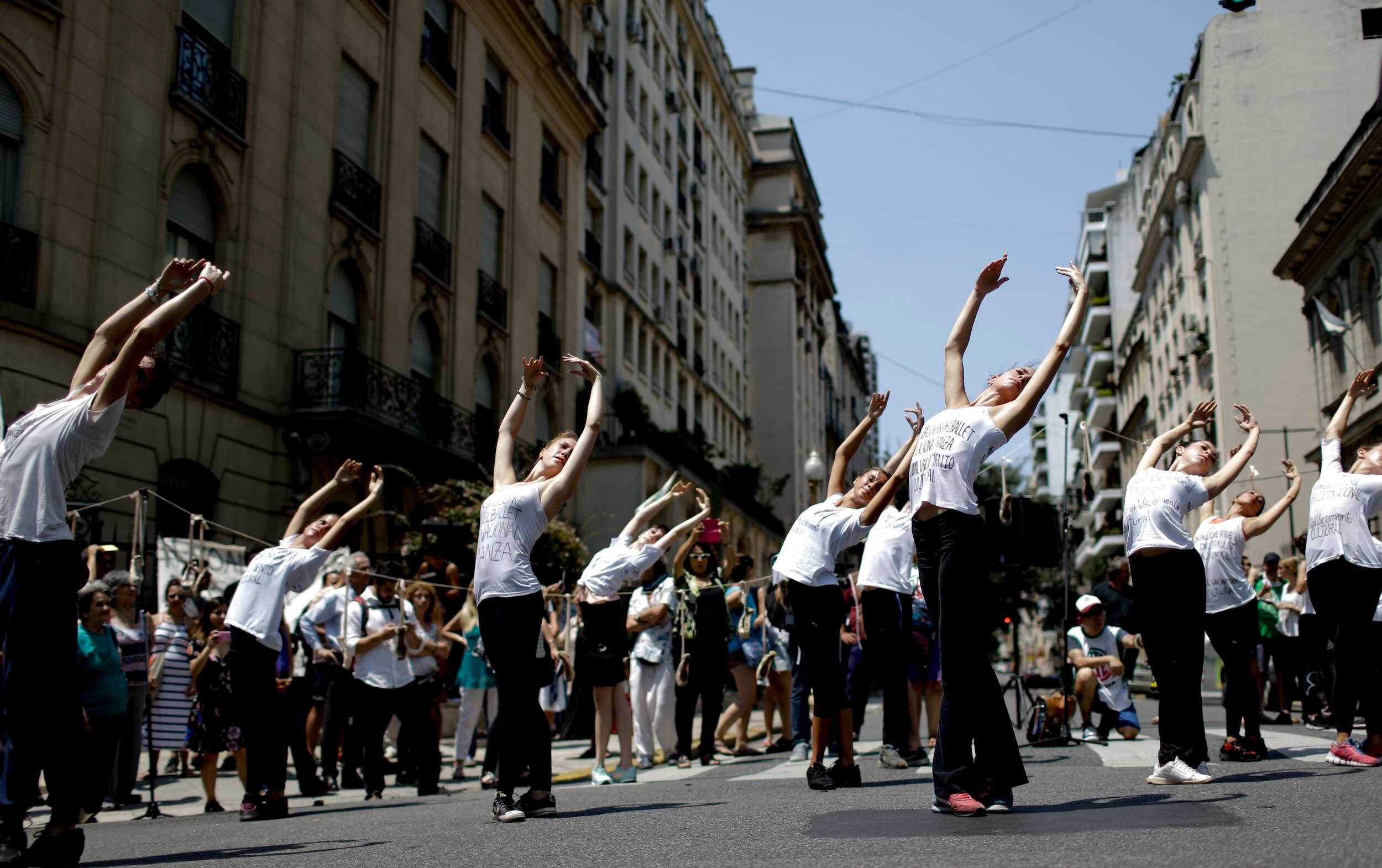 Un grupo de bailarines paralizó hoy el tránsito en el centro de Buenos Aires e interpretó “El lago de los cisnes” en medio de la calle, en rechazo a una reciente decisión del gobierno de Mauricio Macri de recortar el financiamiento de la compañía.