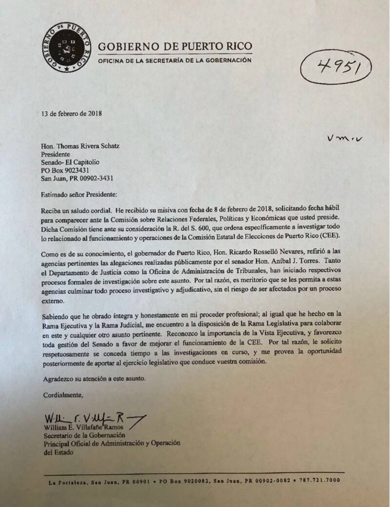 En dos cartas separadas, cursadas al presidente del Alto cuerpo, Thomas Rivera Schatz, ambos le indicaron que esperarán por las pesquisas que realizará el Departamento de Justicia y la Administración de Tribunales, antes de comparecer ante la Asamblea Legislativa, en aras de no entorpecer el proceso de las agencias que pertenece a la Rama ejecutiva.