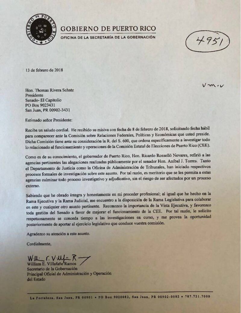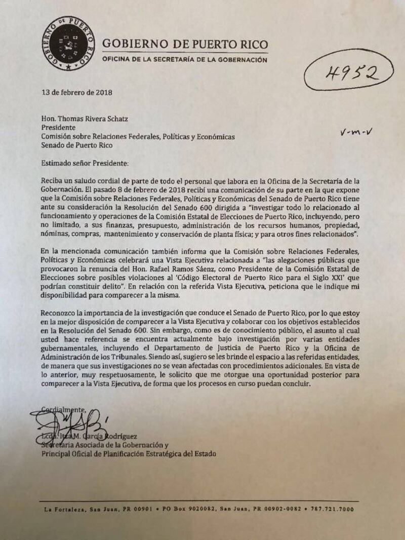 “El asunto al cual usted hace referencia se encuentra actualmente bajo investigación por varias entidades gubernamentales, incluyendo el Departamento de Justicia de Puerto Rico y la Oficina de la Administración de Tribunales. Siendo así, sugiero se le brinde el espacio a las referidas entidades, de manera que sus investigaciones no se vean afectadas con procedimientos adicionales”, reza la misiva de García.