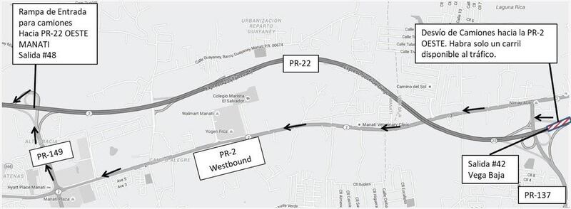 Como consecuencia de estos trabajos, se estará implementando un desvío de vehículos pesados en la PR-22 a la altura del KM 42 (Salida #42 en Vega Baja) dirección hacia Arecibo desde el sábado 17 de febrero a las 11:00 AM hasta el domingo 18 de febrero a las 6:00 PM. Todos los vehículos pesados serán desviados por la salida #42 hacia la PR-137 y luego tendrán que acceder la PR-2 en dirección hacia Manatí, al llegar a la intersección de la PR-2 con la PR-149 en Manatí pueden acceder la PR-22 (Dirección hacia Arecibo) según se muestra en el mapa adjunto para que lleguen a sus respectivos destinos.