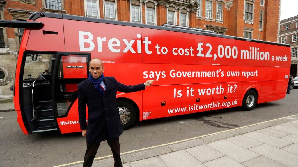 El autobús, financiado por donantes individuales dice en un cartel que el costo del Brexit será de 2,000 millones de libras (2,800 millones de dólares) por semana. El cálculo se basa en una estimación del gobierno, de que la salida significará una caída del PIB del 5% a lo largo de 15 años.