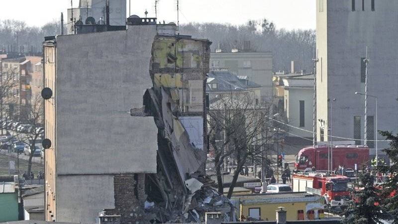 TVP INFO mostró parte del edificio de cuatro pisos derrumbado y a socorristas buscando entre los escombros pese a las temperaturas bajo cero. También había policías interrogando a testigos.
