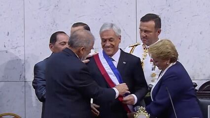 Michelle Bachelet, por mandato popular, dejó su cargo y ahora asumió el Presidente Sebastián Piñera, quien recibió la banda de manos del timonel del Senado, Carlos Montes.