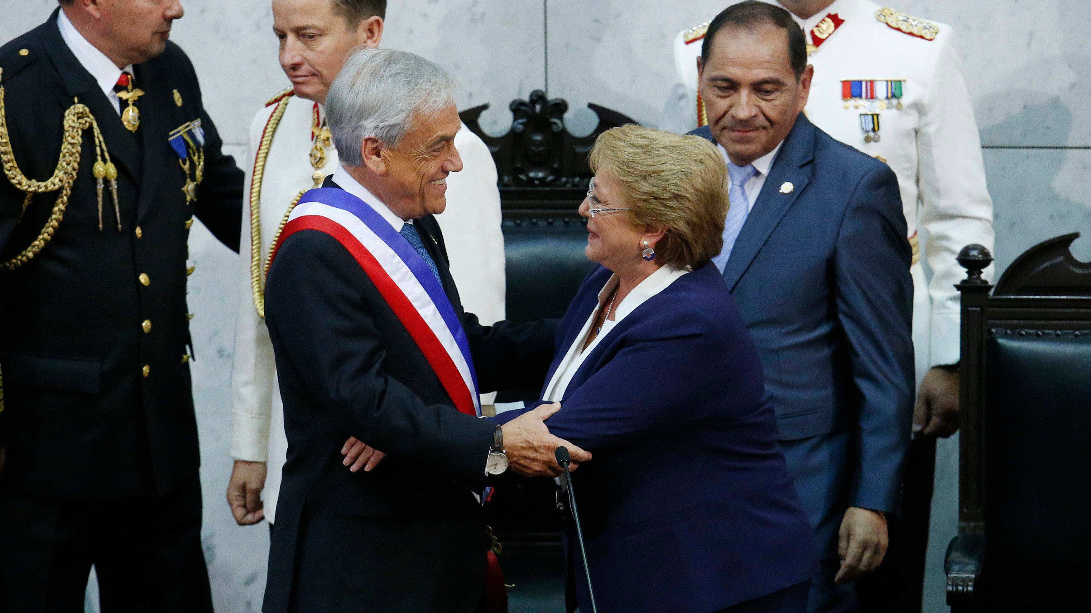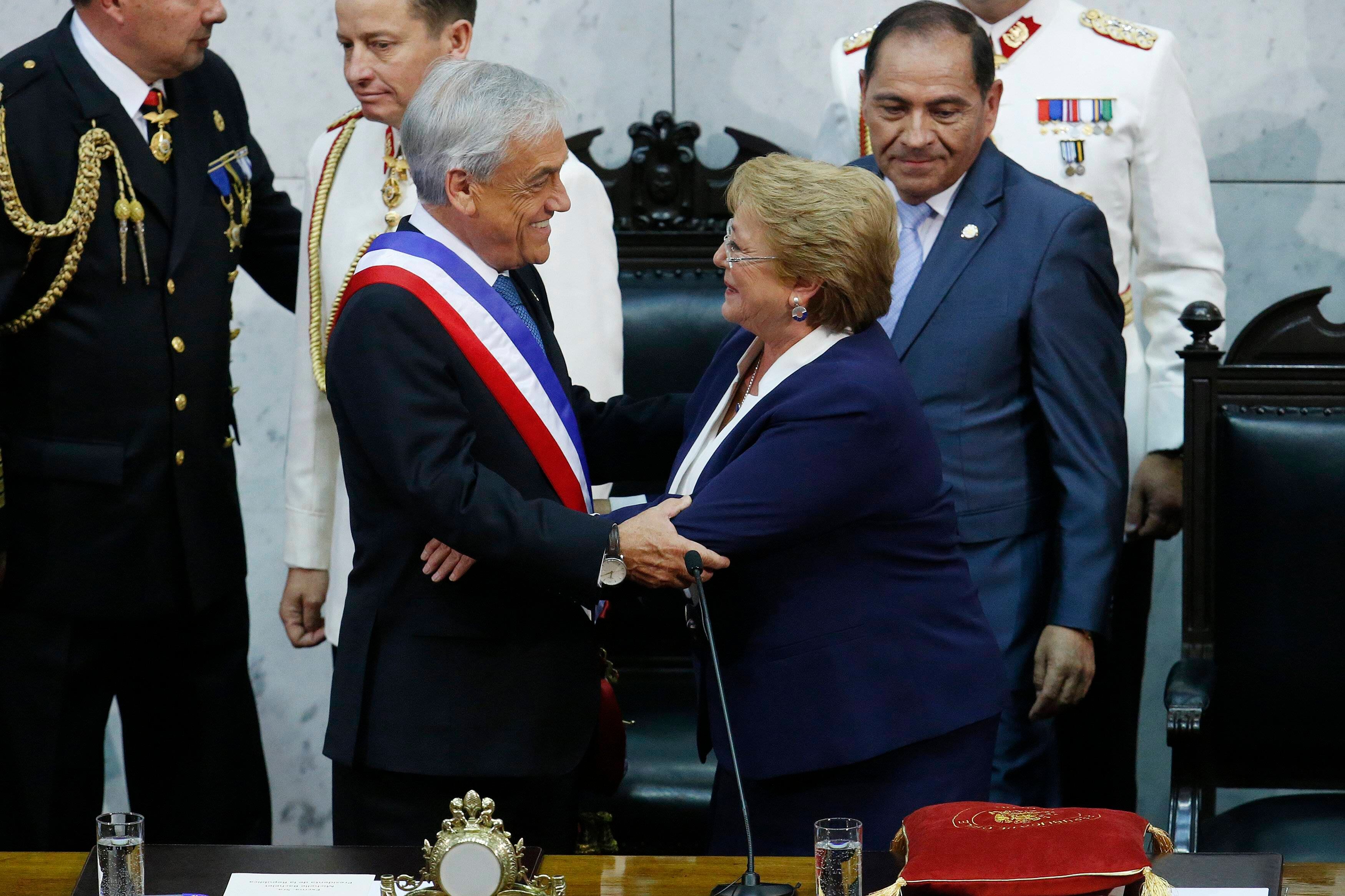 A continuación, Montes le impuso la banda presidencial a Piñera Echenique y Bachelet le colocó al nuevo jefe de Estado la piocha de Bernardo O’Higgins, el segundo símbolo del poder en este país sudamericano.