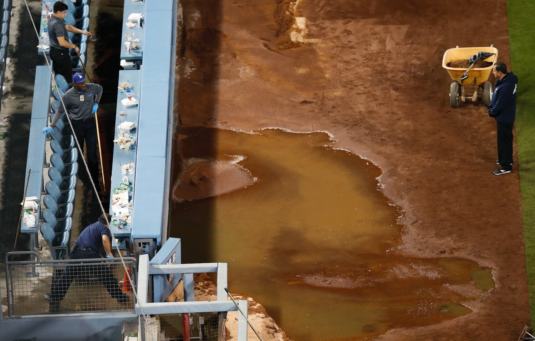 El partido fue declarado oficial luego de una demora de 32 minutos con dos outs en la parte baja de la entrada, dando a los Dodgers una ventaja de 4-3 sobre sus rivales. El derrame dejó un charco de agua sucia cerca dela banca de los Dodgers.