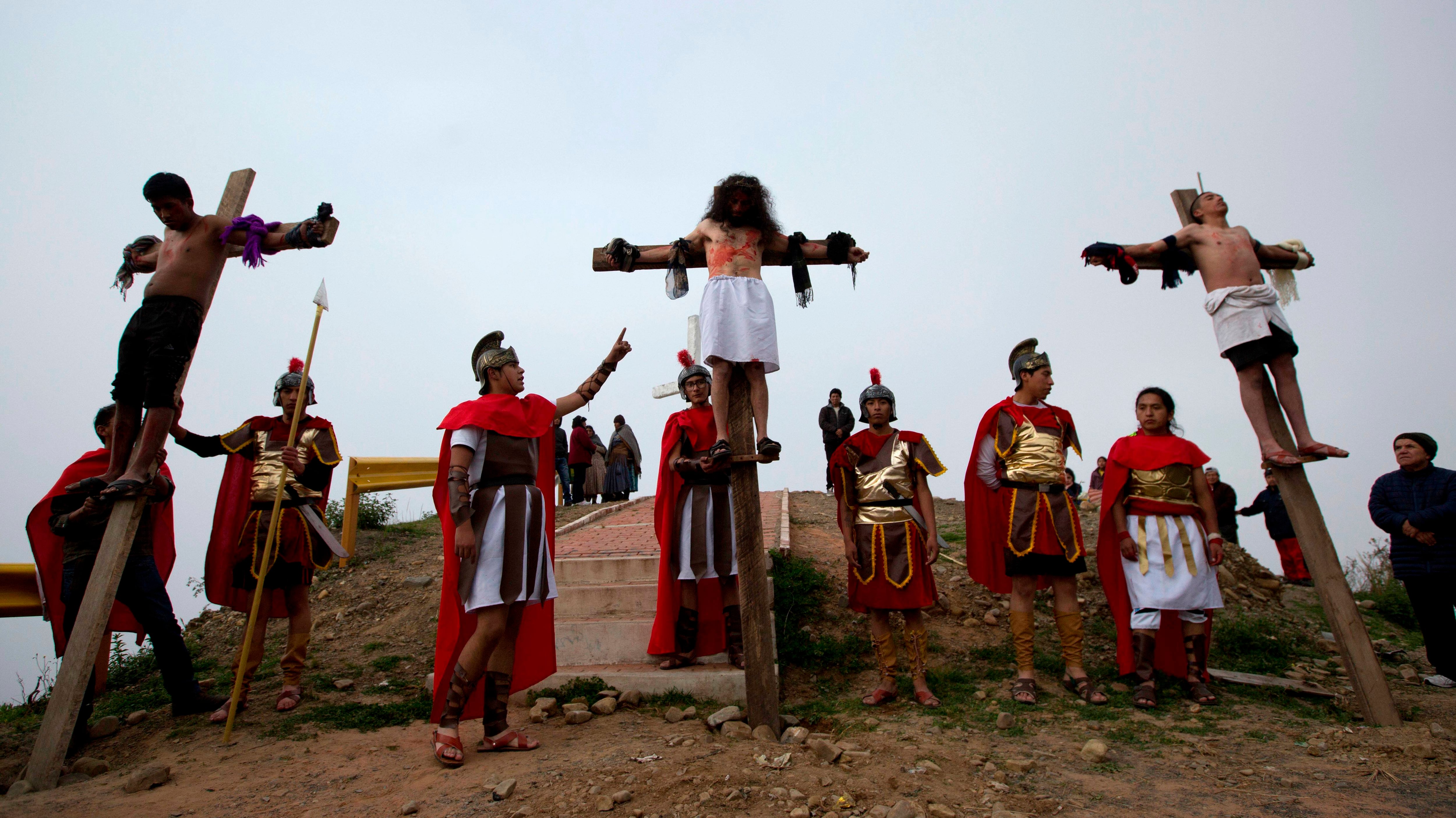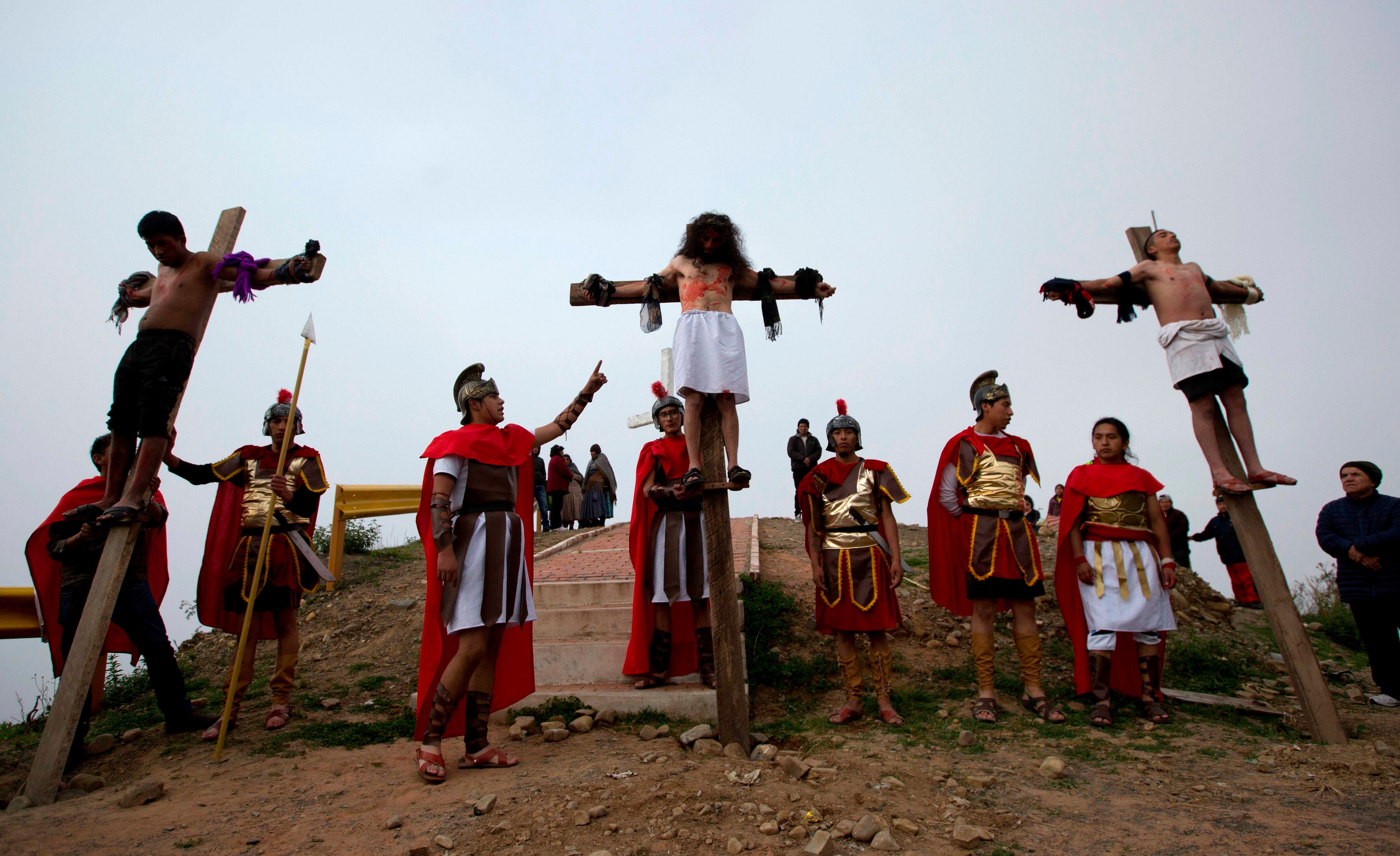 En una colina frente a La Paz, Bolivia, personas disfrazadas de soldados romanos ataron a hombres a cruces de madera mientras mujeres hincadas interpretaron el papel de las Tres Marías.