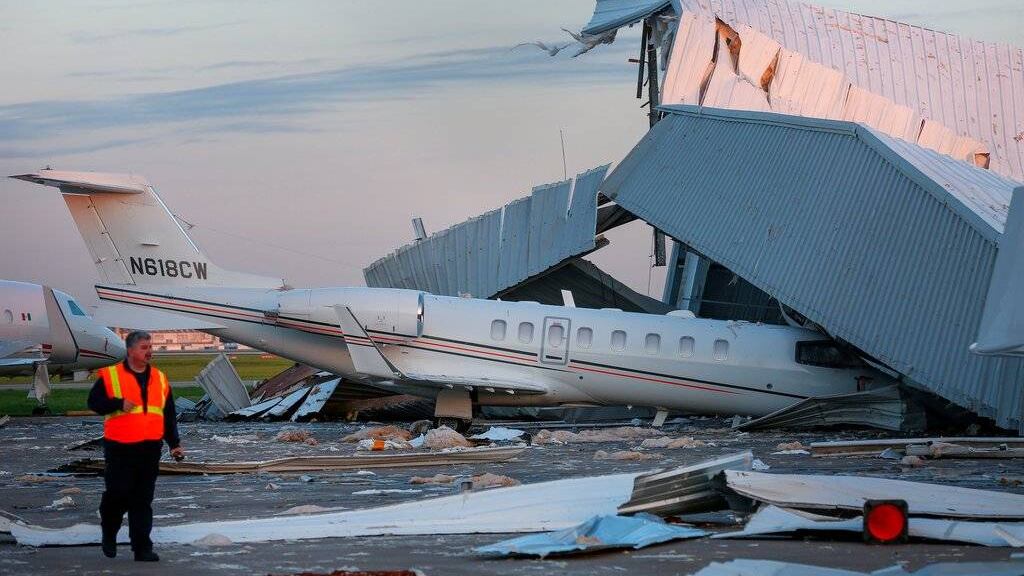 Las autoridades dicen que al parecer los vientos hicieron que el hangar de un terminal privado colapsara. El portavoz del aeropuerto Bill Begley dijo que la destrucción del hangar representa millones de dólares en daños. No se reportaron heridos.
