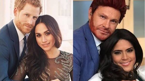 Para este divertido momento, Lachapel usó una chaqueta blanca y cabello ondulado para imitar a Markle, mientras que el presentador mexicano lució un saco azul y se tintó el pelo de rojo para parecerse a Harry.