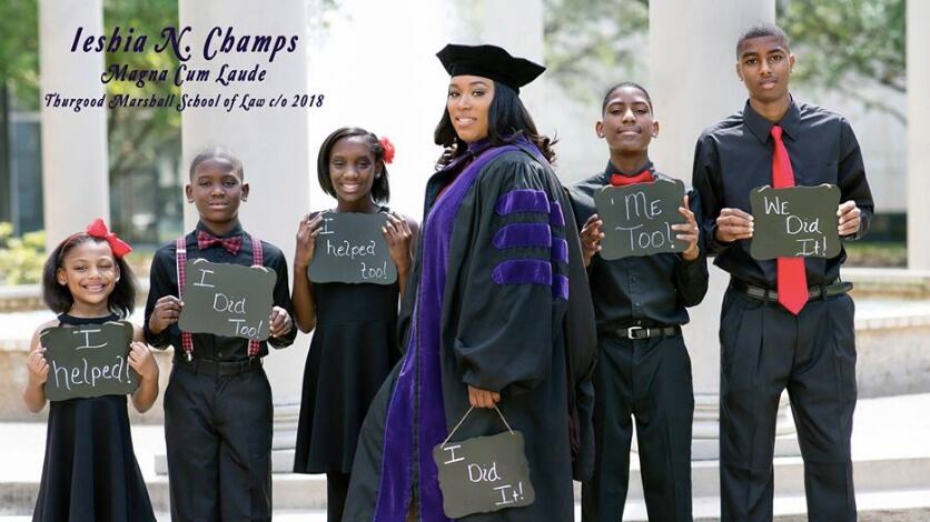 Criar cinco hijos sola no fueron un impedimento para que Leshia Champs, de 33 años, lograra su meta de graduarse de la Thurgood Marshall School of Law en Texas con un doctorado en jurisprudencia.