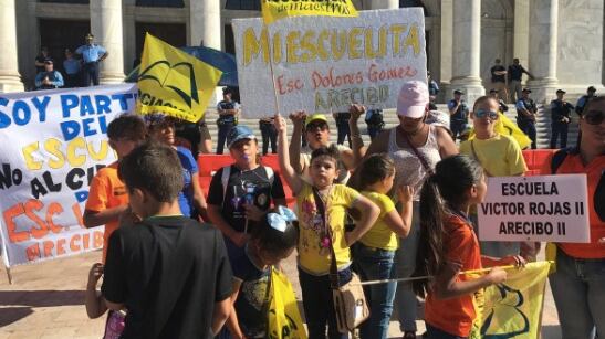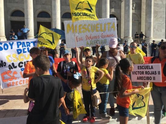 Mientras niños, maestros y padres se manifiestan en contra del cierre de escuelas que propone en el Departamento de Educación, un contingente de oficiales de la Policía custodian las escalinatas del Capitolio en horas de la tarde de hoy, miércoles.