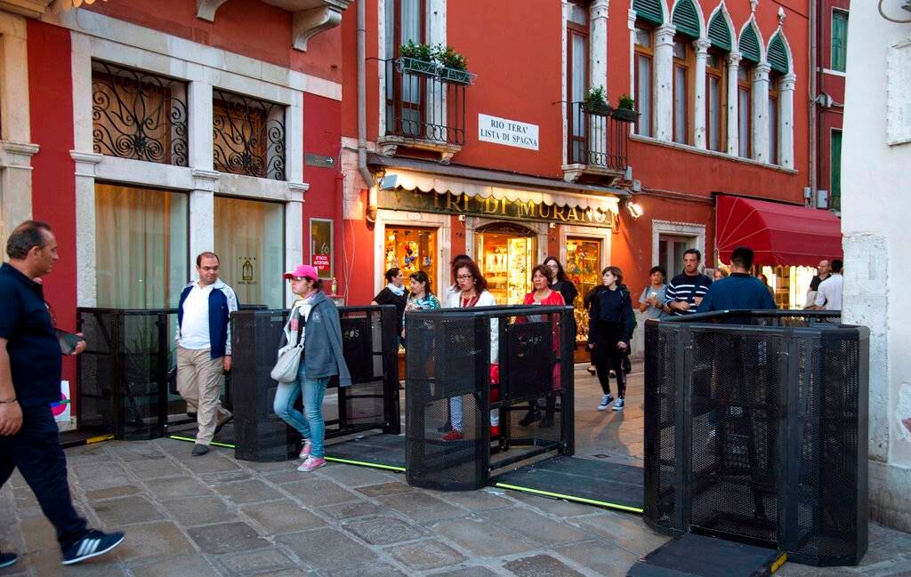 Las autoridades de Venecia instalaron puertas temporales en los extremos de dos puentes para bloquear la entrada de turistas a la ciudad, en caso de que consideren que son demasiados.
